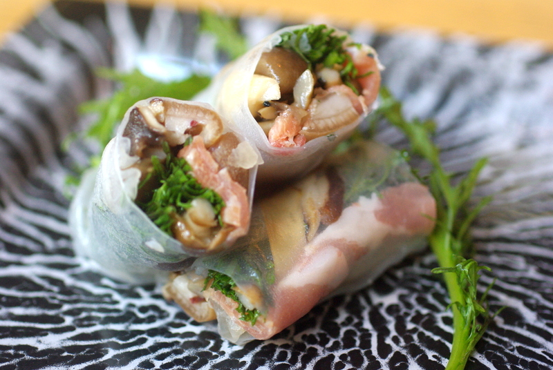 バスク豚の生ハムとコラーゲンたっぷりの豚足を、生春巻きで巻いて。