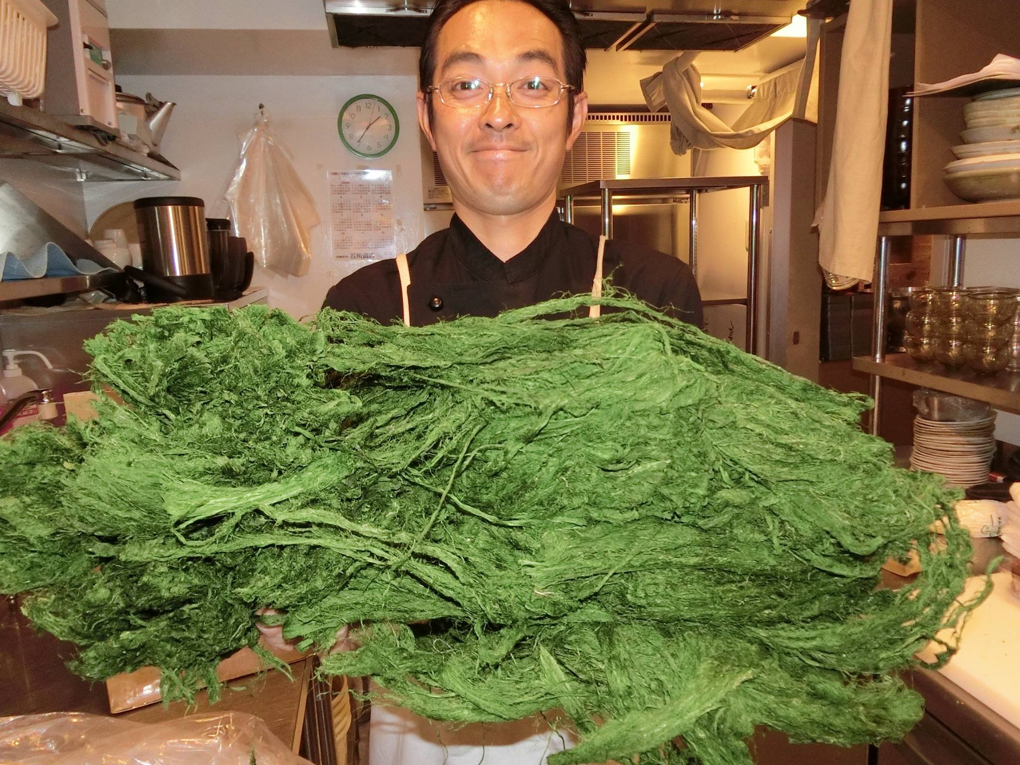 調理場の永山が抱えるのは1キロ分の「あおさのり」。今が旬。天麩羅にするか、あおさ汁か・・・